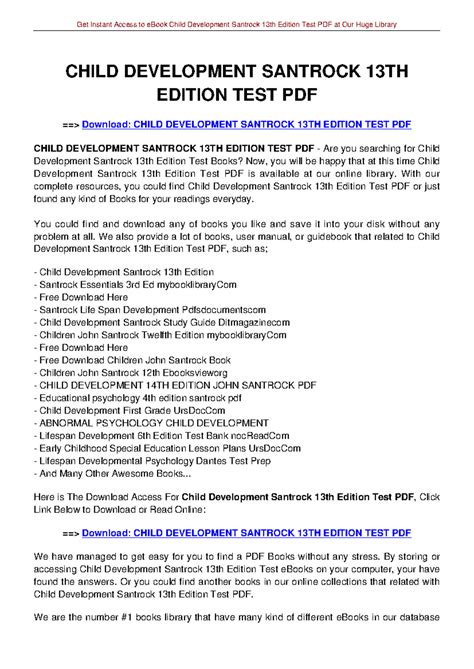 In order to read or download Child Development Santrock 13th Edition Test ebook, you need to create a FREE account.