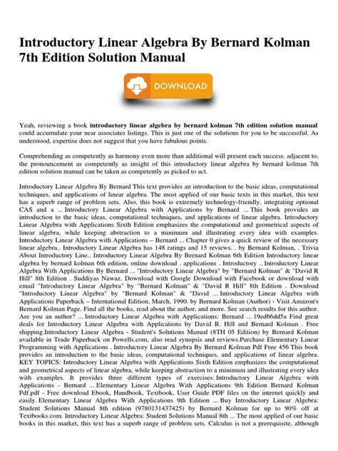 In order to read or download Solution Manual Introductory Linear Algebra Bernard Kolman ebook, you need to create a FREE account.